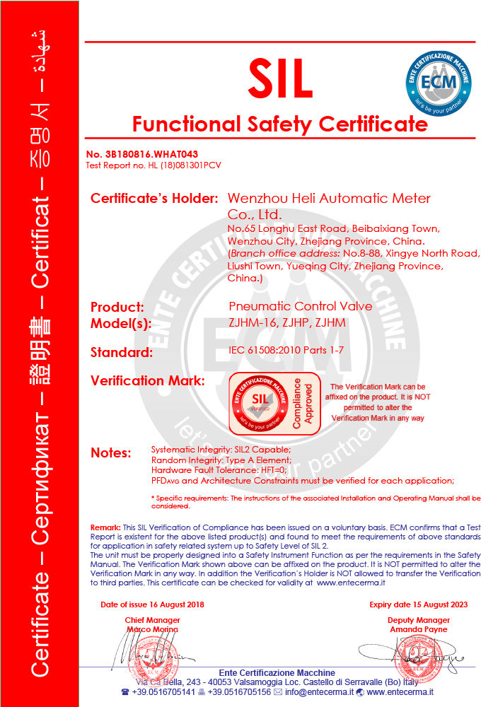 ZJH氣動調節閥SIL證書
